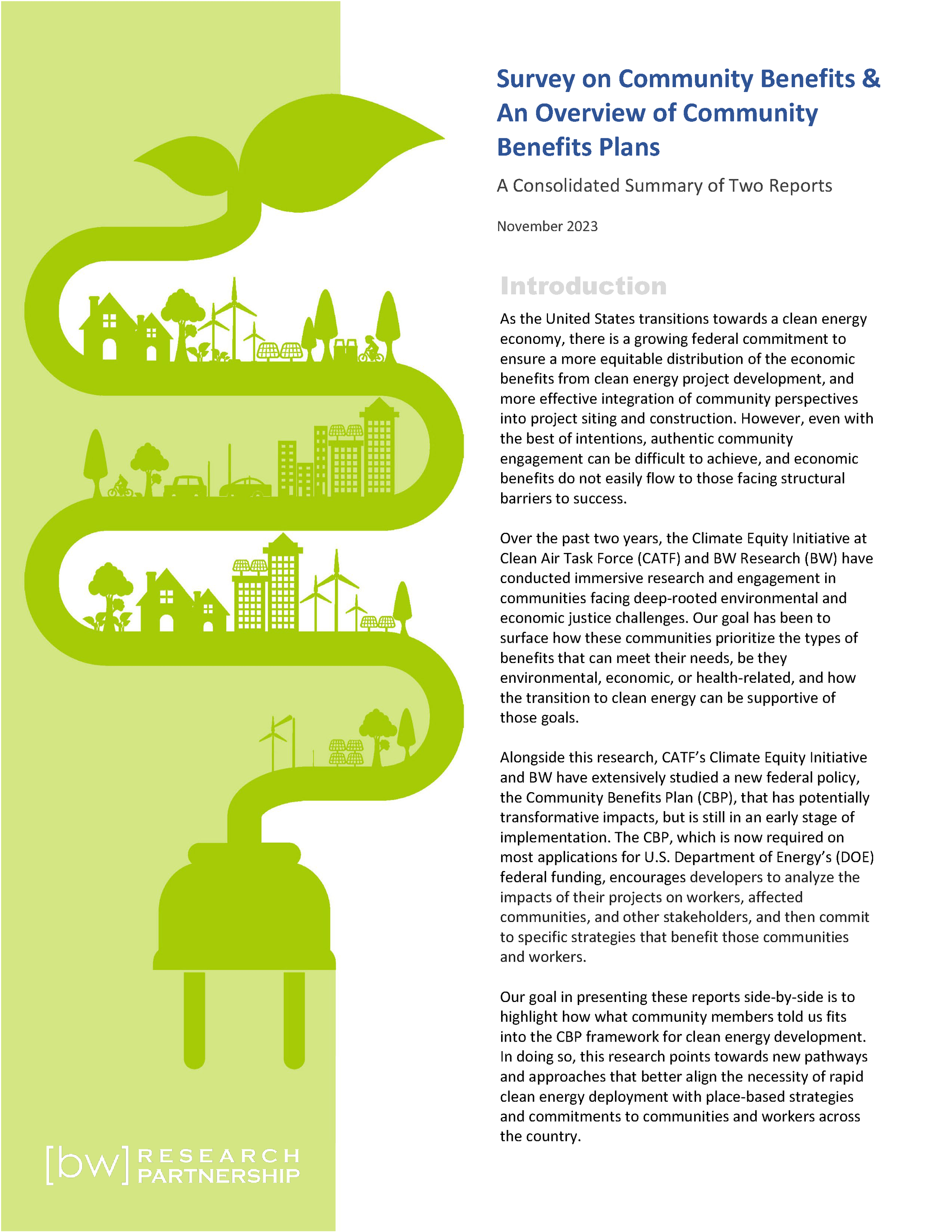 The Community Benefits Plan (CBP) process is a first-of-its-kind effort at the Department of Energy (DOE) to leverage the opportunity for significant climate and clean energy funding to encourage a more equitable, place-based approach to project development. As part of completing a CBP, developers, and other grant applicants must research the impacts of their projects on workers, and affected communities, and then commit to specific strategies that address those impacts. By requiring a CBP for most DOE grant applications, the agency hopes to improve project viability by maximizing more equitable community and worker benefits from those projects. This report addresses Community Benefits Plans with a focus on the U.S. Department of Energy’s federal funding requirements.